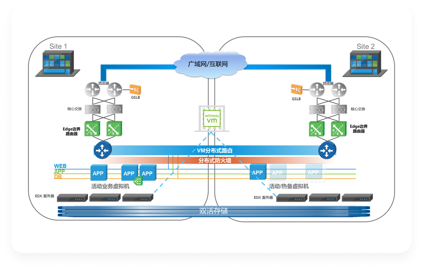 The two centers each have storage resources, and a third-party witness site runs a witness host. All hosts are taken over by a management platform and run in the same virtualization cluster, so the high availability function of virtualization can be used without the need for an application cluster. All virtual machines can be started in other centers after a single center fails, and the switching time is 2 to 10 minutes. If you want to speed up the disaster switching time, applications need to be deployed in a cluster, that is, each application deploys multiple virtual machines, running in two data centers and providing services at the same time. For upper-layer applications to be able to communicate in both data centers at the same time, it is necessary to implement the "big second layer" and "distributed gateway" in the two locations through network technology to ensure that no matter which data center the virtual machine runs in, the same IP can be accessed anywhere.